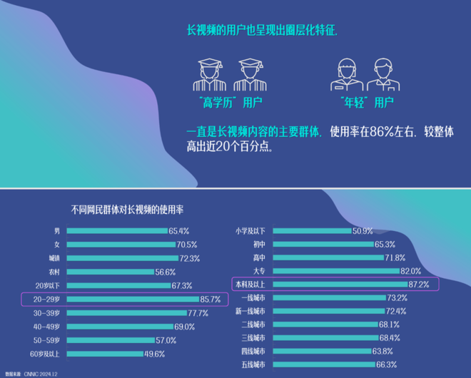 二者的受众也有不少差别。《中国网络视听发展研究报告(2025)》指出,长视频用户呈现明显的圈层化特征,高学历用户和年轻用户一直是长视频内容的主要群体,使用率较整体用户高出近 20 个百分点。