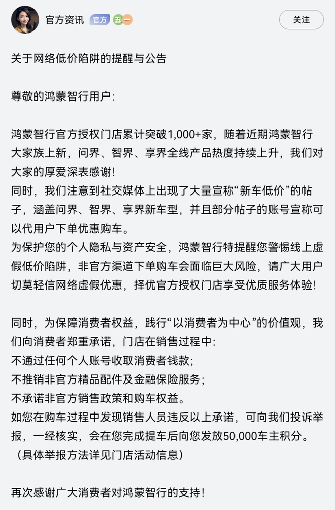 5月2日,鸿蒙智行在其官方App发布《关于网络低价陷阱的提醒与公告》。公告称,鸿蒙智行官方授权门店已超 1000 家,近...    5月2日,鸿蒙智行在其官方App发布《关于网络低价陷阱的提醒与公告》。