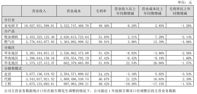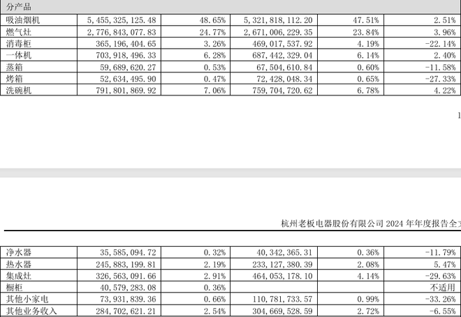 老板电器2024年财报显示,吸油烟机、燃气灶这两大类产品的营业收入之和占到总收入的70%以上,且去年分别有2.51%、3.96%的增长。