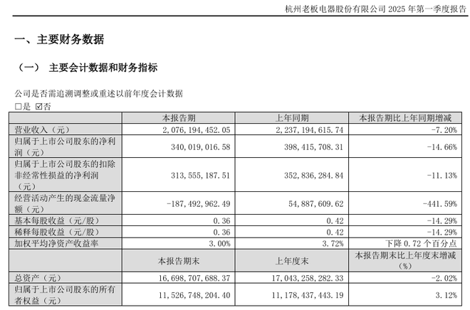 老板电器年报显示,2024年,公司营业收入为112.13亿元,同比微增0.10%,归母净利润为15.77亿元,同比下降8.97%,而今年一季报显示,老板电器营业收入为20.8亿元,同比下降7.2%,归母净利润为3.4亿元,同比下降14.7%。