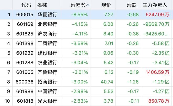 “五一”节前最后一个交易日,银行板块集体调整,华夏银行大跌超8%,北京银行、工商银行、农业银行、建设银行跌幅均在3%以上。