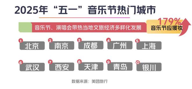 据美团旅行数据,“五一”音乐节Top10的热门城市为:北京、南京、成都、广州、上海、武汉、西安、天津、青岛、银川。此外,受演唱会、音乐节带动,宝鸡、常州、滁州、孝感、阜阳、伊宁成为“五一”热门小城。