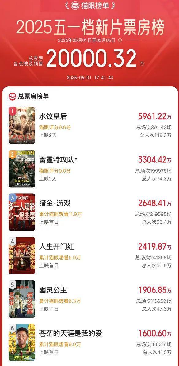 据第三方平台猫眼专业版数据,截至5月1日13时47分,2025年五一劳动节票房破亿元;截至5月1日17时41分,2025年“五一档”总票房(含点映及预售)破2亿元。