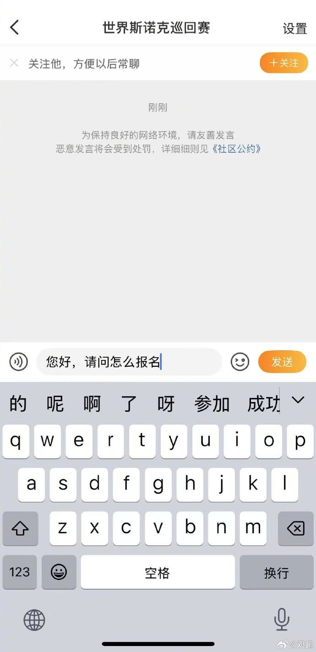 5月4日,邓超通过微博晒出其在世界斯诺克巡回赛(WST)官方账号的私信处报名页面的截图。