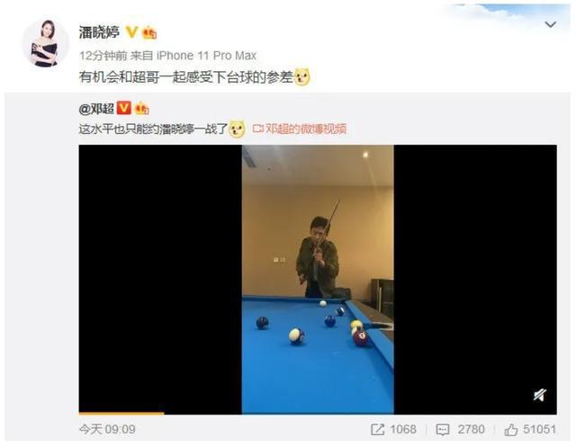 随后,潘晓婷转发并回复:“有机会和超哥一起感受下台球的参差。”