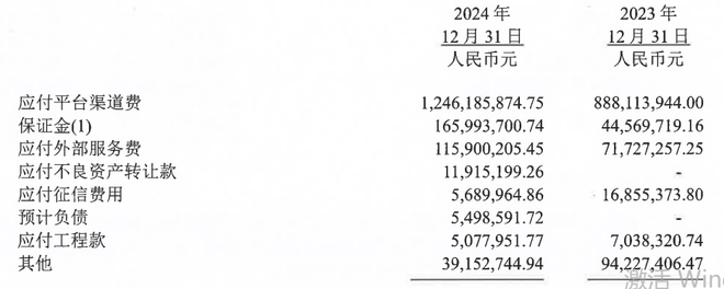 2023年末,该机构的三方合作渠道占比为54.69%,此类业务合作模式主要为分润模式;也有少部分的担保模式。财报数字显示,在主要负债中,中邮消金2024年应付平台渠道费12.46亿元,保证金为1.66亿元。