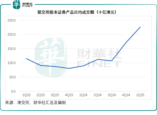 从港交所的2025年第1季业绩可以看到,这几个季度港股市场的成交额明显上升,见下图,2025年第1季联交所股本证券产品日均成交额按年大增1.53倍,至2,254亿港元。
