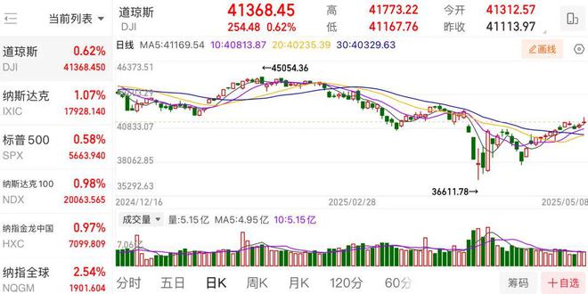 英美达成贸易协定当日美股上涨, 道琼工业指数上涨254.48点或0.62%收于41368.45点,标普500指数上涨32.66点或0.58%收于5663.94点,纳斯达克指数上涨98点或1.07%收于17928.14点。