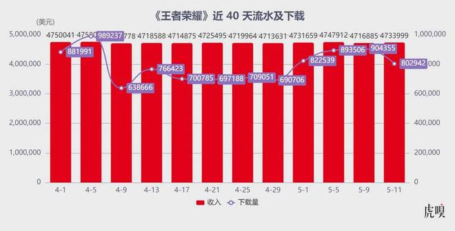 作为一款上线近十年的产品,《王者荣耀》后劲十足,4 月全球收入大增 71%,重回全球手游收入榜首,进而带动腾讯手游收入提升 10%,稳居中国手游发行商收入总榜冠军(下图为虎嗅基于点点数据样本列出《王者荣耀》近 40 天下载及流水变化,可以看到其市场表现极为稳健)。