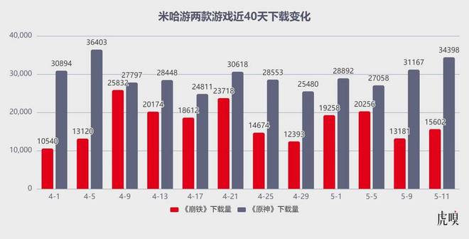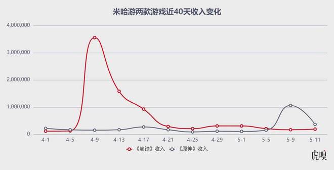 上述局面主要得益于,《崩铁》于 4 月 9 日版本更新后,游戏流水快速飙升至两周年庆最高值,并再次登顶中国、日本、韩国等市场 iOS 手游畅销榜,月内收入激增 192%,进而将米哈游收入爆拉 51%(下图为虎嗅基于点点数据样本列出《崩铁》近 40 天下载及流水变化,可以明显看到其市场表现在 4 月 9 日达到月内峰值)。