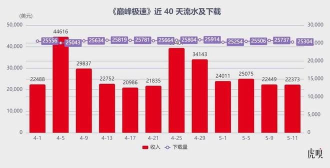 值得一提的是,在腾讯与网易贴身肉搏的全球竞速手游市场,《巅峰极速》超越《QQ飞车》成为 4 月全球收入最高的竞速分类游戏(上图为虎嗅基于点点数据样本列出《巅峰极速》近 40 天下载及流水变化,可以明显看到月初联动与月中传说赛车上线市场表现出现明显波动)。