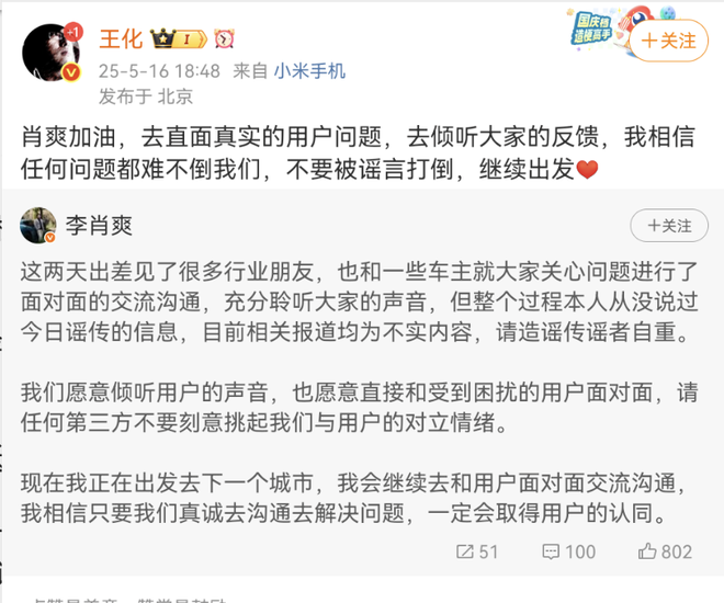对此,小米汽车副总裁李肖爽发文回应,“这两天出差见了很多行业朋友,也和一些车主就大家关心问题进行了面对面的交流沟通,充分聆听大家的声音,但整个过程本人从没说过今日谣传的信息,目前相关报道均为不实内容,请造谣传谣者自重。”