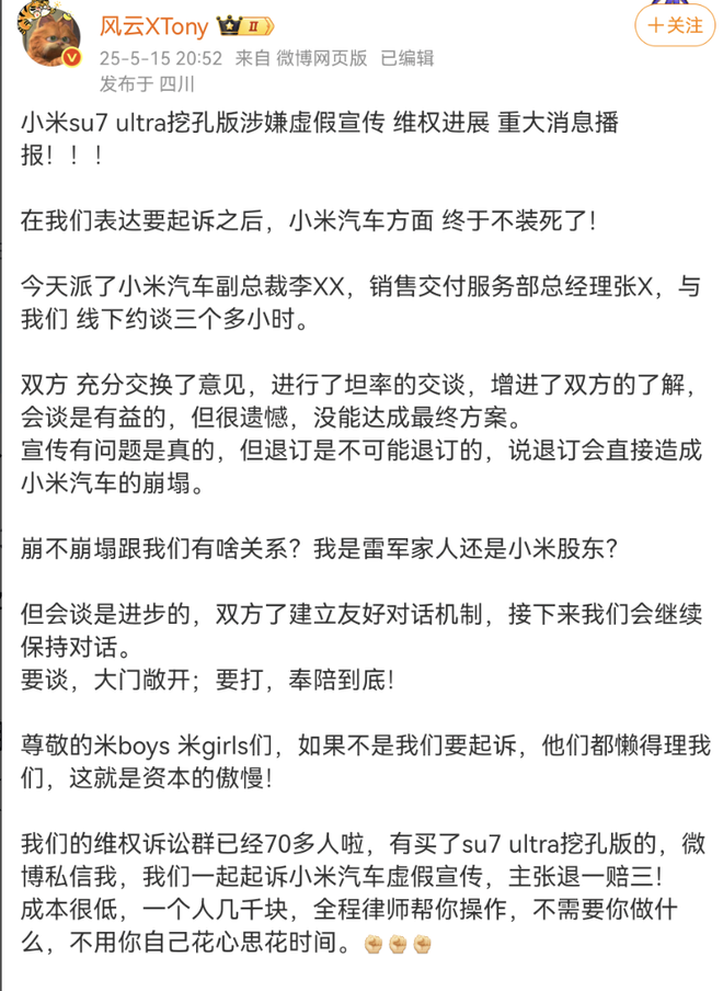 5月15日,博主“风云XTony”就“小米SU7 Ultra挖孔版涉嫌虚假宣传”一事发文透露曾与小米汽车副总裁李XX、销... 5月15日,博主“风云XTony”就“小米SU7 Ultra挖孔版涉嫌虚假宣传”一事发文透露曾与小米汽车副总裁李XX、销售交付服务部总经理张X进行了长达3小时的线下约谈,并表示对方称,退订会直接造成小米汽车崩塌。