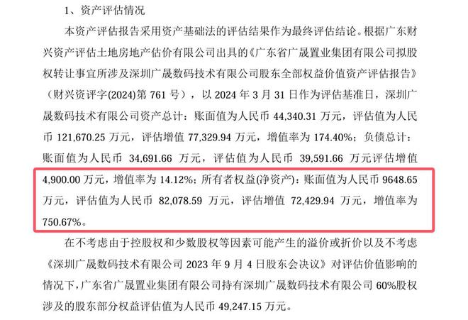 从账面价值来看,以2024年3月31日为评估基准日,广晟数码净资产账面值为9648.65万元,评估值8.2亿元,评估增值7.24亿元,溢价率高达750.67%。