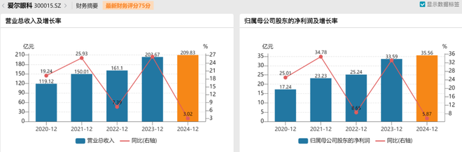 但2024年,曾以稳健增长态势领跑行业的爱尔眼科业绩表现却不尽人意。财报数据显示,公司全年实现营收209.8亿元,增速仅为3.02%,较过往两位数增长显著放缓;归母净利润虽达35.56亿元,同比增幅却收窄至5.87%,业绩增速再度滑落至个位数区间。