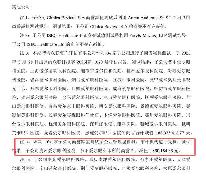值得一提的是,2024年,公司聘请众联资产评估有限公司针对84家子公司进行测试,列出部分子公司商誉合计减值1.85亿元,而164家子公司由企业管理层自测、审计机构复核,贵州爱尔眼科医院、东阳爱尔眼科诊所商誉合计减值仅为186万元。