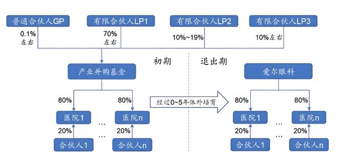 在这个模式里,爱尔眼科就像一个"小老板",作为有限合伙人,在收购基金里占10%-20%的股份,还会让核心人才成立小公司去参股新建的眼科医院。