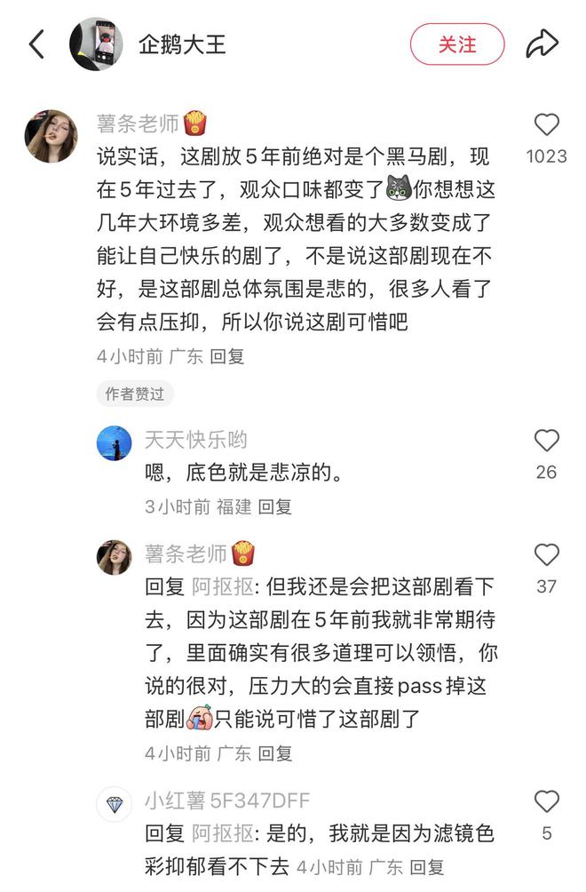 观众的喜好也确实在发生变化。比如《人生若如初见》一手好牌打到如此惨淡的局面,只能说是时运不济。剧的配置和质量都没有问题,但文娱消费环境变了、观众口味变了,五年前甚至三年前观众还有更多耐心去看严肃题材,而现在小红书上甚至有观众直接表示"我知道剧很好,但我就是看不下去,我这种山猪大概就吃不了这种细糠"。大家在巨大的生活压力之下,对娱乐产品的需求更偏向于逃离和治愈现实,连BE(bad ending悲剧结局)、OE(open ending开放式结局)都会被骂,不爽、不甜、不能带来轻松快乐的剧,更是很难进入市场主流。