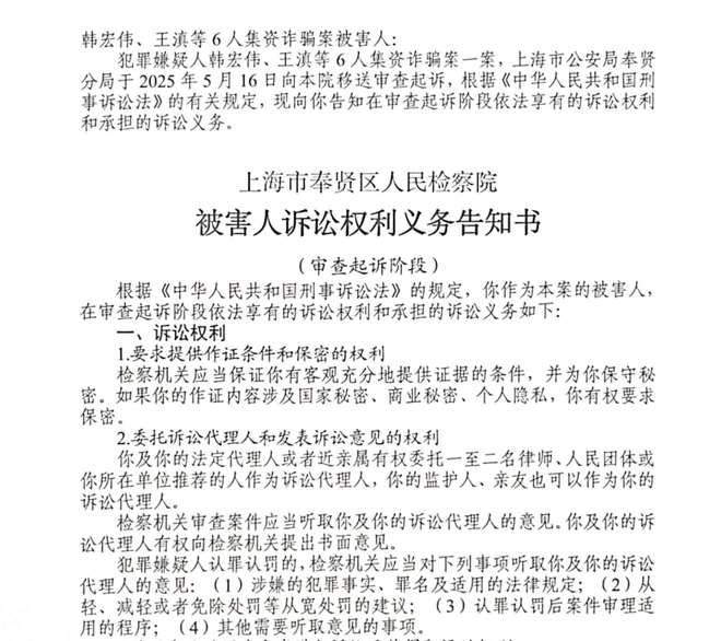 据上海市奉贤区人民检察院近日发布的重大案件信息,犯罪嫌疑人韩宏伟(海银财富实控人)、王滇等6人集资诈骗案一案,上海市公安局奉贤分局于2025年5月16日向该院移送审查起诉。上海市奉贤区人民检察院同时发布了被害人诉讼权利义务告知书,告知集资诈骗案被害人在审查起诉阶段依法享有的诉讼权利和承担的诉讼义务。