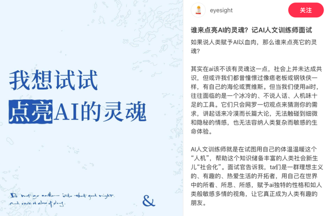 在思考毕业去向时,他偶然在小红书的官网上看到了招募通知,岗位叫“AI人文训练师”。羽山当即投递了简历,一个念头从脑海中冒了出来:AI行业终于走到了需要人文研究者的阶段。