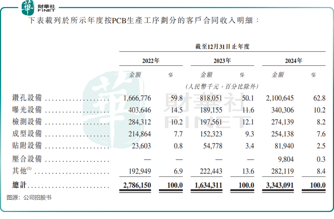 由于产品线涵盖PCB生产多道工序,大族数控的收入结构亦较为多元,其中包括钻孔设备、曝光设备、检测设备及成型设备等。