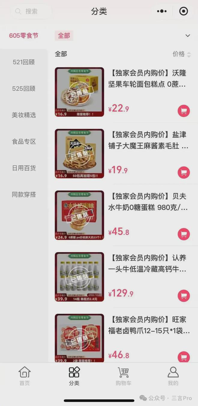 目前有不到70种商品,主要是服饰和零食和一些百货,但所有商品都显示已售罄。