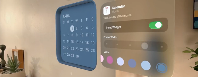 令笔者印象深刻的是“小组件功能”。用户可以通过Vison Pro在室内的墙上悬挂虚拟表盘,相册等虚拟物件。