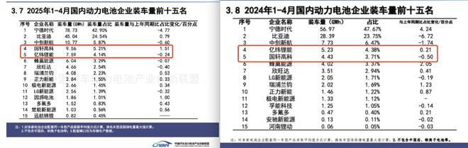 另据中国汽车动力电池产业创新联盟发布的国内动力电池企业装车量榜单显示,今年1-4月,亿纬锂能排名第五,装车量占比4.14%,同比下滑0.24%,被国轩高科反超。另外,宁德时代和比亚迪同期装车量占比为42.9%和24.54%,两者合计市占率超67%。