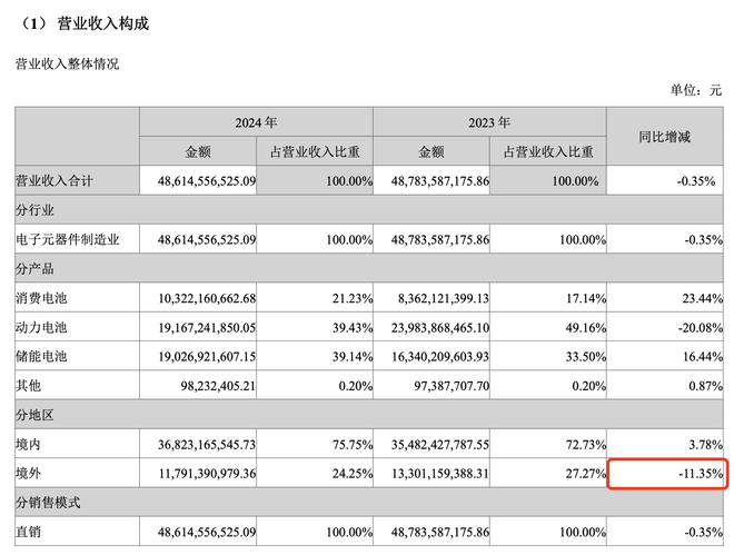 尽管亿纬锂能正持续发力海外,但据其年报显示,其2024营业收入为486.15亿元,同比下降0.35%;归母净利润为40.76亿元,同比增长0.63%。其中,其境外收入占总营收比重为24.25%,达117.9亿元,同比下滑11.35%。