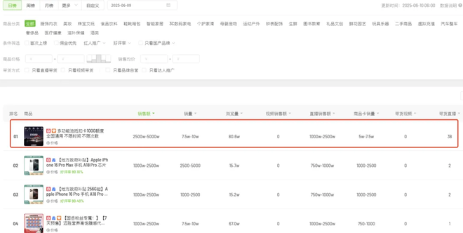 飞瓜数据显示,6月9日一条"多功能油抵扣卡1000额度"的商品链接销售额为2500万~5000万元,登顶平台全品类商品销售榜首,甚至超越了iPhone 16 Pro Max等热门数码产品。