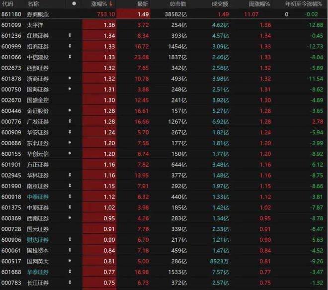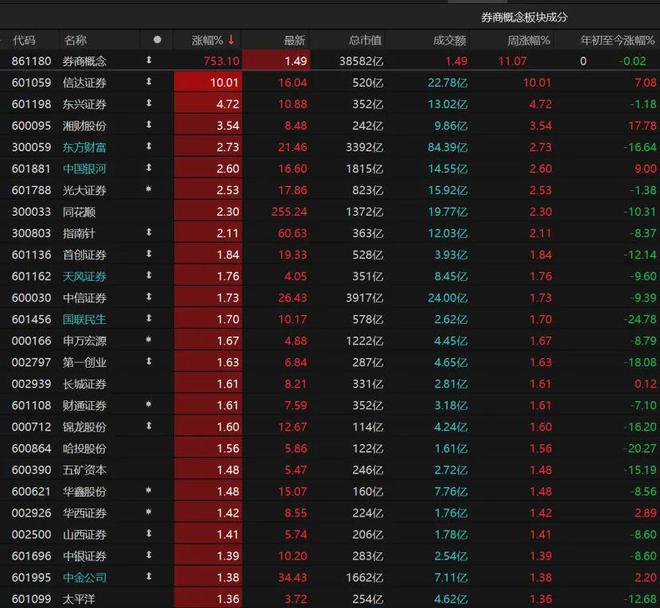 中央汇金控股的其他券商股也表现出色。其中,中国银河收涨2.6%报16.6元/股,中金公司收涨1.38%报34.43元/股,中信建投收涨1.33%报23.68元/股,申万宏源收涨1.67%报4.88元/股。