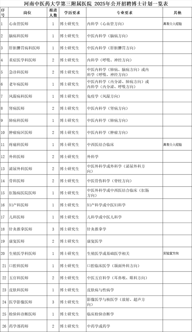 根据岗位空缺情况和医院发展需要,招聘博士研究生40名。详见附件 1《河南中医药大学第三附属医院 2025 年公开 招聘博士计划一览表》。