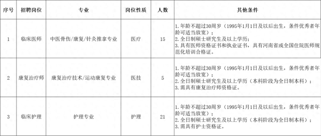详见《河南省洛阳正骨医院(康复院区)工作人员招聘计划一览表(第一批)》(附件)。