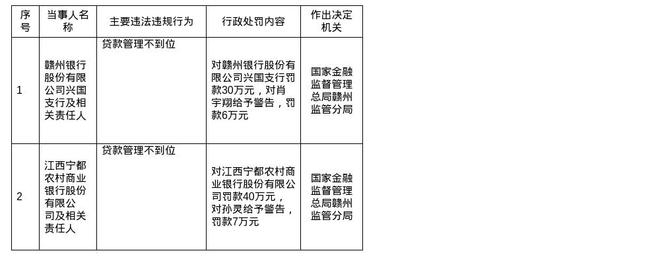 此外,江西宁都农村商业银行股份有限公司,同样因贷款管理不到位的问题,被罚款40万元。责任人孙灵被给予警告,并处以7万元罚款。![]()