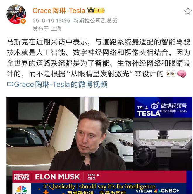 特斯拉副总裁陶琳发文称:马斯克在近期采访中表示,与道路系统最适配的智能驾驶技术就是人工智能、数字神经网络和摄像头相结合。...    特斯拉副总裁陶琳发文称:马斯克在近期采访中表示,与道路系统最适配的智能驾驶技术就是人工智能、数字神经网络和摄像头相结合。因为全世界的道路系统都是为了智能、生物神经网络和眼睛设计的,而不是根据“从眼睛里发射激光”来设计的。