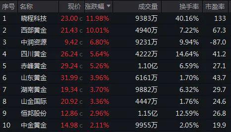 黄金股涨幅居前,西部黄金涨停,晓程科技涨超10%,西部黄金涨停。