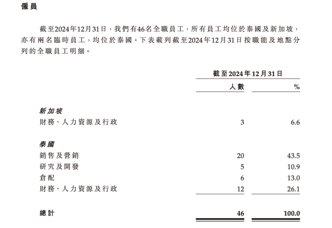 并且,公司仅有的46名员工还不在其最大市场中国,而是分散在新加坡和泰国。其中,全职销售和营销人员20名;财务、人力资源和行政合计15人;仓配管理团队6人,负责监督采购、生产和分销事项;产品研发团队仅5人。