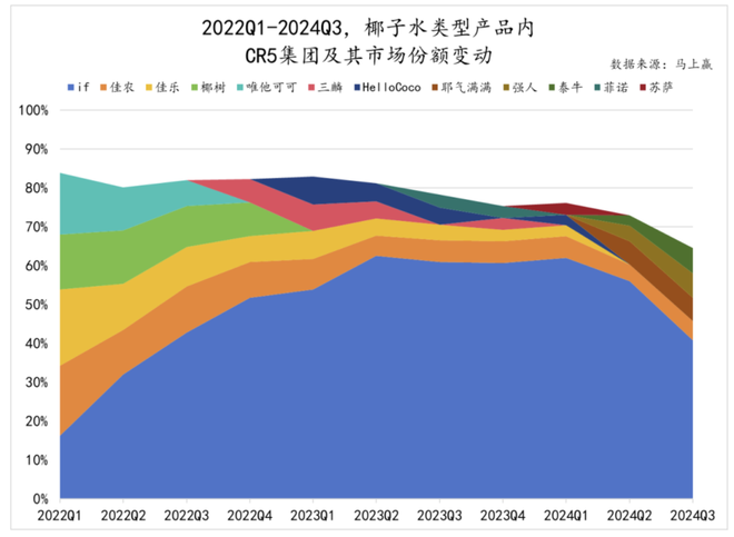 去年前五大品牌合计市占率(CR5)从约85%下滑至约75%。作为“老大”的if椰子水也面临挑战,其市占率由去年第一季度的60%左右下滑至第三季度的40%出头。