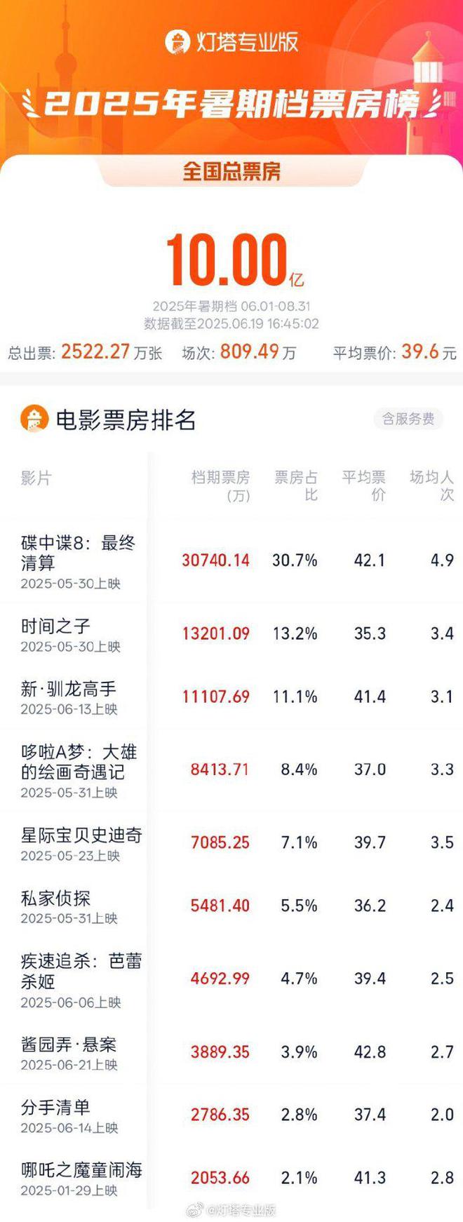 据灯塔专业版,截至6月19日16时45分,2025年暑期档(6月-8月)总票房(含预售)突破10亿,《碟中谍8:最终清算... 据灯塔专业版,截至6月19日16时45分,2025年暑期档(6月-8月)总票房(含预售)突破10亿,《碟中谍8:最终清算》《时间之子》《新·驯龙高手》《哆啦A梦:大雄的绘画奇遇记》《星际宝贝史迪奇》暂列票房前五名。