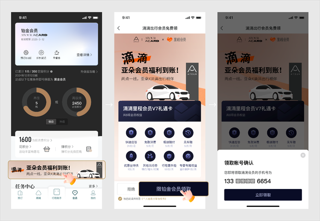 图注:进入滴滴App或小程序-我的-里程会员页,领取亚朵体验会员权益