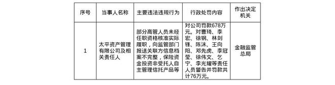 太平资管被罚678万,责任人共被罚76万 访客 2025-07-05 19:22:02 142 默认 摘要: 蓝鲸新闻7月5日讯,近日,国家金融监督管理总局对太平资产管理有限公司及相关责任人开出罚单。罚单显示,太平资产管理有限公司... 蓝鲸新闻7月5日讯,近日,国家金融监督管理总局对太平资产管理有限公司及相关责任人开出罚单。罚单显示,太平资产管理有限公司的主要违法违规行为是:部分高管人员未经任职资格核准实际履职,向监管部门报送关联方信息档案不完整,以及保险资金投资非受托人自主管理信托产品等。针对以上问题,国家金融监督管理总局对太平资产管理有限公司罚款678万元。同时,对曹琦、李宏、徐钢、林剑锋、陈沫、王向阳、邓先虎、李冠莹、徐伟文、乞宁、李光耀等责任人员给予警告,并处罚款共计76万元。 标签: 太平 资产管理 海报 阅读 QQ 分享 微博分享 微信分享 分享 上一篇永赢金融租赁被罚110万,责任人遭警告 下一篇中国农业银行庐山市支行被罚30万,责任人共被罚12万 永赢金融租赁被罚110万,责任人遭警告上一篇 中国农业银行庐山市支行被罚30万,责任人共被罚12万下一篇 相关推荐 太平资产管理 瑞康医药高管连环离职背后:留置疑云与五年业绩滑坡 2025-07-17 一年罚单不断、行长突然离职,杭州银行的“稳”字去哪了? 2025-07-17 2025国际低空经济博览会配套活动——低空产业出海研讨会将于7月25日举办 2025-07-17 互联网大厂的中场战事:2025上半年背后的加减法 2025-07-17 戛纳创意奖还没真正准备好迎接AI 2025-07-17 艺人出逃被骂“血汗工厂”,昔日顶流经纪帝国撑不住了! 2025-07-17 娃哈哈不止一个娃 2025-07-17 中国建设银行金华分行被罚280万,涉多项违规行为 2025-07-17