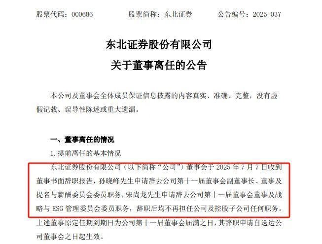 近日,东北证券公告称,公司董事会于7月7日收到董事书面辞职报告,孙晓峰申请辞去公司第十一届董事会副董事长、董事及提名与薪酬委员会委员职务,宋尚龙申请辞去公司第十一届董事会董事及战略与ESG管理委员会委员职务,辞职后均不再担任公司及控股子公司任何职务。