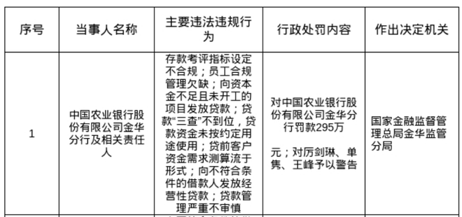 罚单显示,中国农业银行股份有限公司金华分行的主要违法违规事实(案由)为:存款考评指标设定不合规;员工合规管理欠缺;向资本金不足且未开工的项目发放贷款;贷款"三查"不到位,贷款资金未按约定用途使用;贷前客户资金需求测算流于形式;向不符合条件的借款人发放经营性贷款;贷款管理严重不审慎。